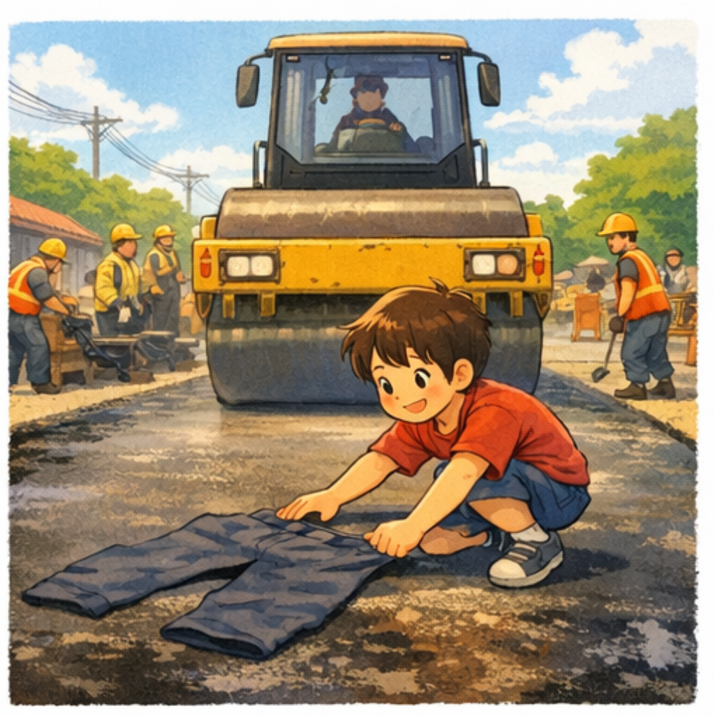 “Perfect,” he said proudly. The road roller came closer. Rrrrrrrrrrrrr… And rolled right over the pants.